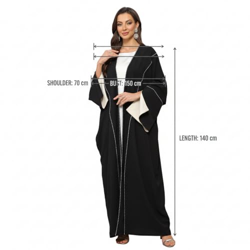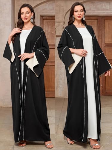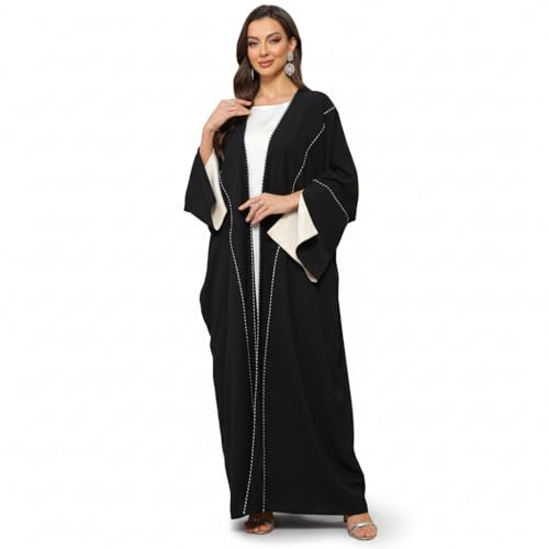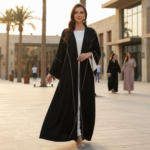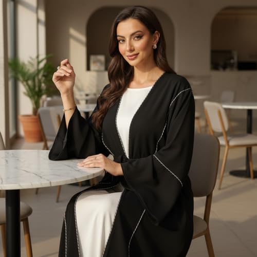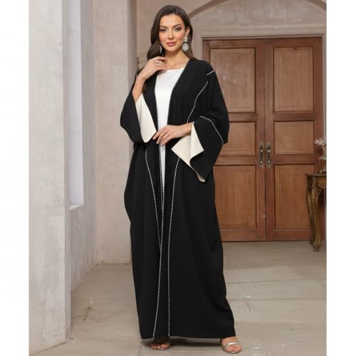 GuLiNiao - Women's Modest Abaya Open Front Cardigan - Elegant Contrast Piping Khaleeji Style Long Dress - Sophisticated Dubai Design for Evening Wear
