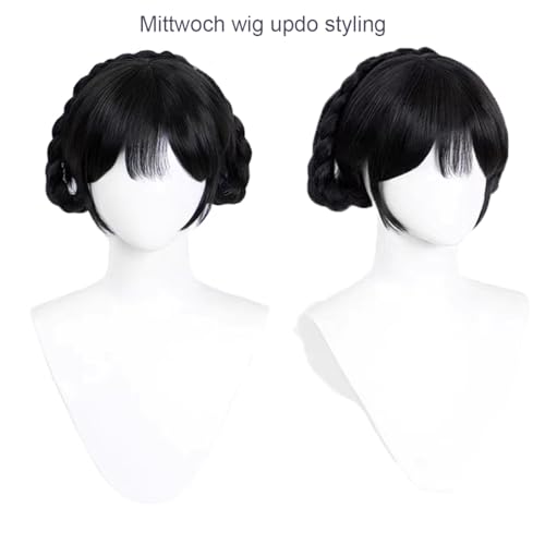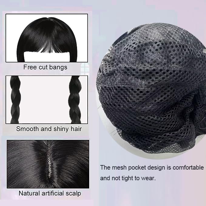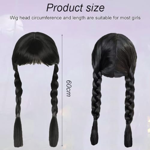 Gxlaihly - Adams Wig with Fringe, Costume Children with Pony Braid, Long Black Double Braided Wigs for Women Girls, Wednesday Cosplay, for Cosplay Party Carnival Halloween