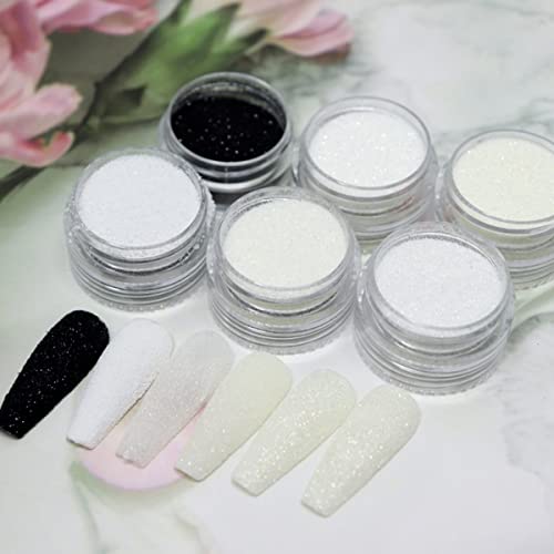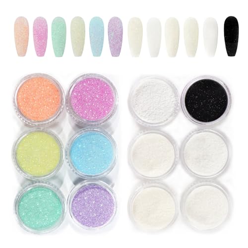 - GZMAYUEN Sugar glitter powder nail and nail art glitter sequins set: 6 pieces black white colour powder sugar effect, 6 pieces coloured skilk colour powder effect sugar effect (purple, pink, green, yellow, orange, blue), 6 colour nail art glitter flakes.