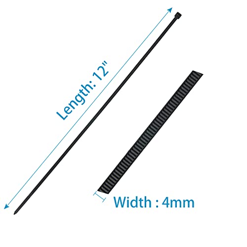 - Black Zip Ties 12 inchHeavy Duty Includes: Length: 12" , Tensile Strength: 50lbs , Width : 4mm ,Color: black , Total Quantity: 100 pcs , Material: UV Resistant Nylon.