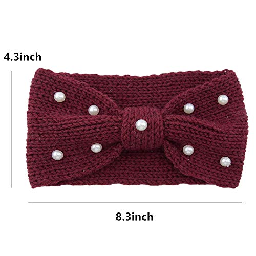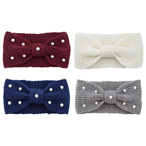 Macloey - H HILABEE 4 Pcs Warm Winter Headbands for Women Elastic Turban Head Wraps Pearl Crochet Hair Band Ear Warmer Headband Gifts (Wine Red+White+Navy+Grey)