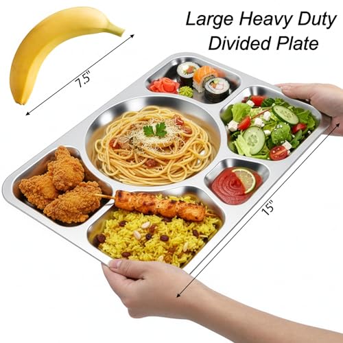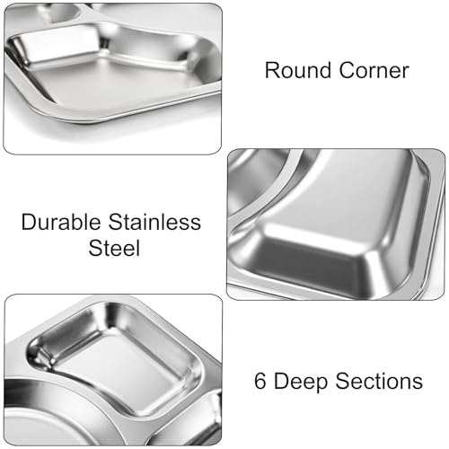 - 6 أقسام مشتركة: تنقسم صواني الستانلس ستيل إلى ستة أقسام بدون حافة حادة، عميقة بما يكفي لتناسب الصلصة والأطباق، مما يسمح لمن يصعب إرضاؤهم بمنع الطعام من اللمس.