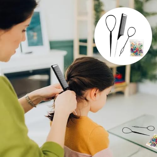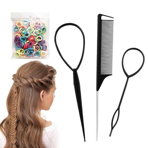 Garzenth - Hair Braiding Tool, Topsy Tail Hair Tool Hair Pull Through Tool Pin Tail Comb Hair Loop Tool French Braid Set with 50pcs Elastic Hair Tie For Women Kids Parting Hair Braid Accessories(balck)
