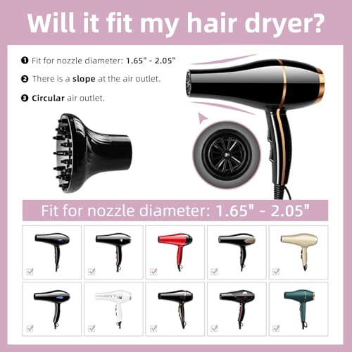 - 【Suitable for 1.65-inch to 2.05-inch Hair Dryer】This universal diffuser uses many soft adhesive strips at the interface, easy installation, you don't have to worry about wearing out your hair dryer casing. And this hair diffuser fits for hair dryer with nozzle diameter of 1.65-inch to 2.05-inch. It is easy to use.