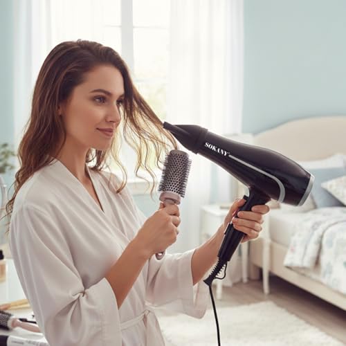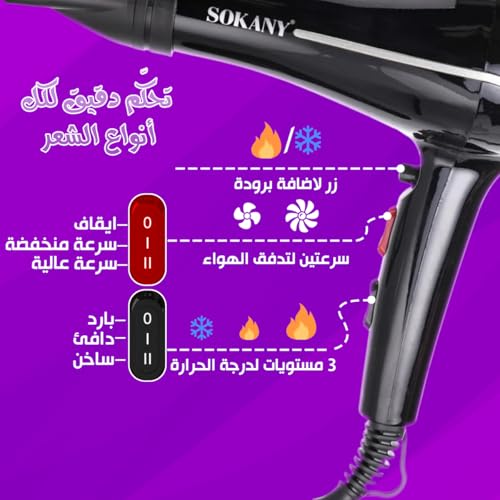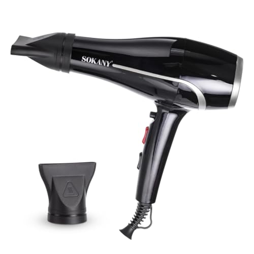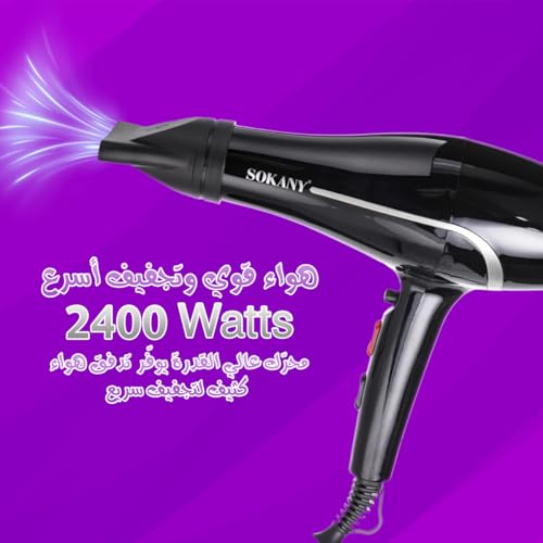 Sokany - مجفف شعر احترافي ايوني 2400 واط، تجفيف سريع، ضوضاء منخفضة، سرعتين واعدادين للحرارة، مكثف قابل للفصل، حماية من الحرارة الزائدة، SK-14021 (اسود وفضي)