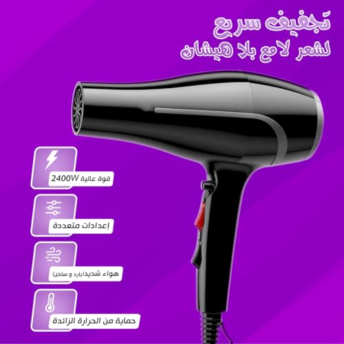 - صباح أسرع، تجعد أقل: مجفف الشعر الأيوني بقدرة 2400 واط يوفر تجفيفًا سريعًا مع نتائج سلسة وضوضاء منخفضة - مثالي لروتين القاهرة المزدحم أو اللمسات في وقت متأخر من الليل.