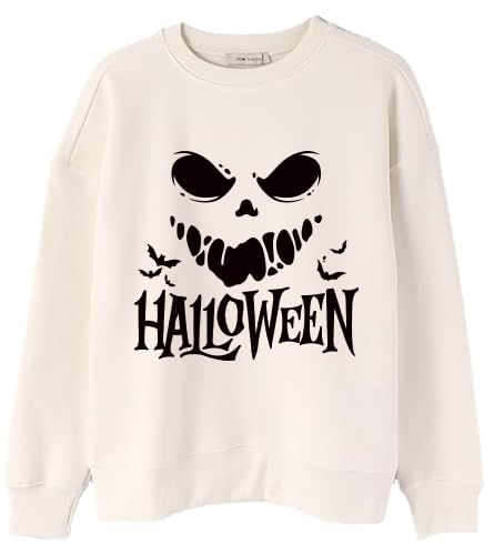 Generic - Halloween Spooky Ghost Face Beige Sweatshirt, Cotton Blend, Unisex Pullover with Bats Design, Holiday Theme Size (M)