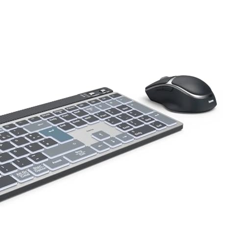 Hama - لوحة مفاتيح وماوس لاسلكي WKM-750 متعدد الأجهزة: 1× اتصال لاسلكي، 2× بلوتوث للكمبيوتر واللاب توب والتابلت، كيبورد صامت ليد، زاوية كتابة قابلة للتعديل، مفتاح FN، تخطيط QWERTZ DE، ماوس صامت مريح من هاما