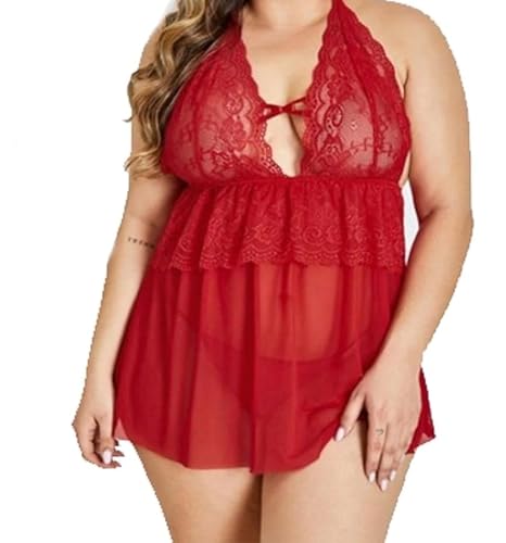 هنادي - Hanady Women Seethrough Halter V Neck Babydoll - Plus Size - Tulle & Lace Fabric