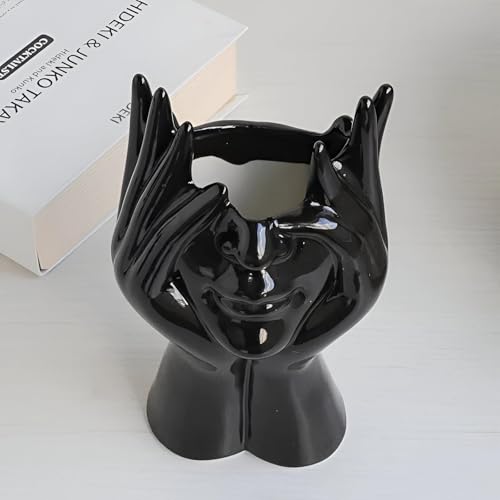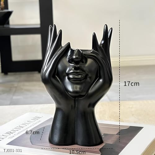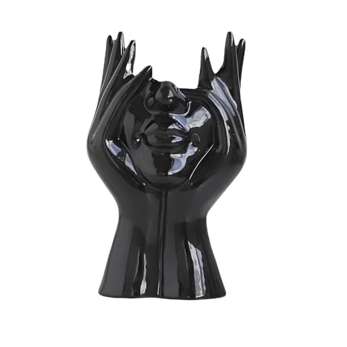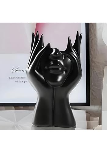 - Elegant black ceramic sculpture showcases two hands gently cradling a stylized face, creating a striking modern art piece that adds a sophisticated, sculptural focal point to any room while maintaining a sleek, glossy finish.