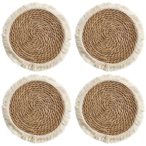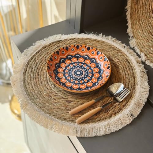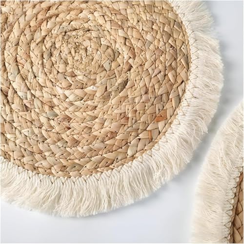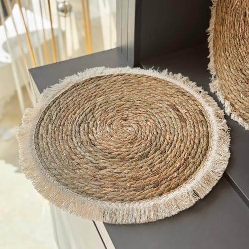 AREXOL - واقي أطباق مصنوع يدوياً من ألياف النخيل المجدولة مع حواف بشراشيب بوهيمية — فرشة مائدة طبيعية عازلة للحرارة للمطبخ وتزيين موائد الطعام والقهوة — مفارش ريفية مصنعة يدوياً لأجل تنسيق منزلي راقٍ، 35 سم