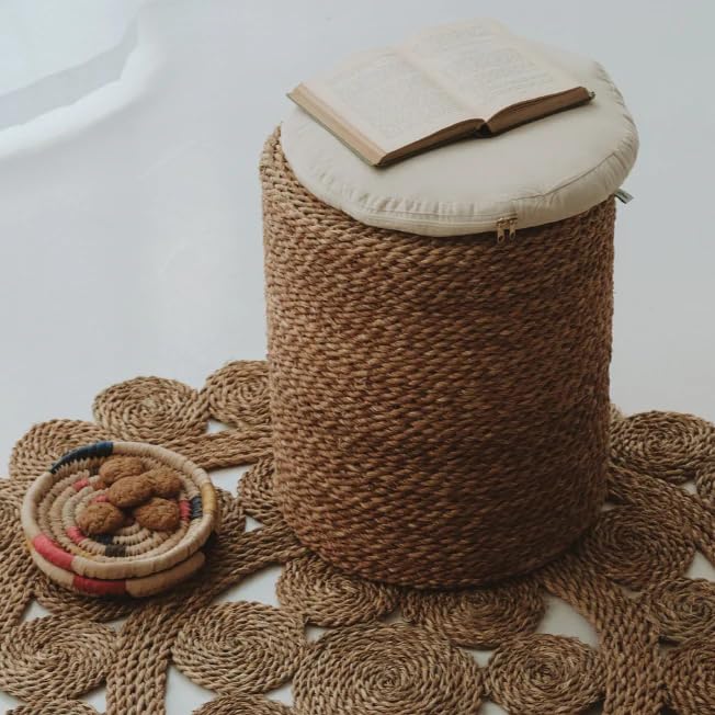 Generic - Handcrafted Halfa Natural Fiber Storage Stool, Cylindrical Woven Jute with Cushioned Seat, 37x37 cm, Beige