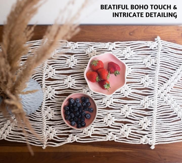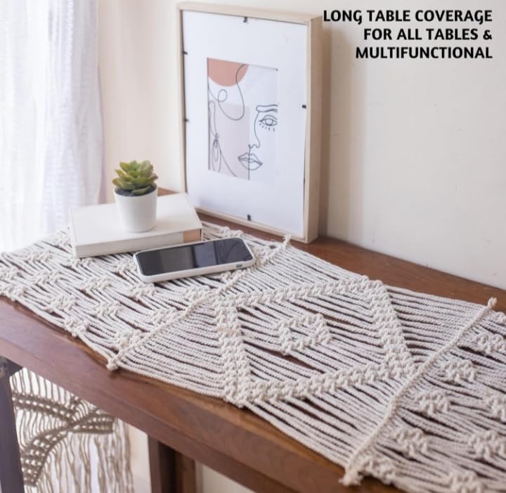 - Handmade Macrame Stylish 100% Natural Cotton Stylish Bohemian Design Adding Attractive Decorative Touch Size 150x20 Cm Perfect For Rectangular Tables Multiple Uses: Dinning, Coffee Table, Or Natural Beige Color Occasions Suitable For Various Tasks Durable And Easy To Clean Perfect For Daily Decoration Or Special Occasions