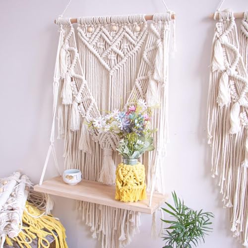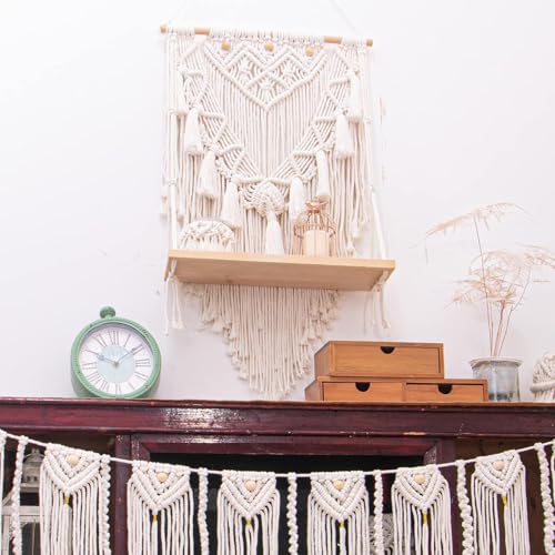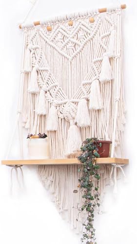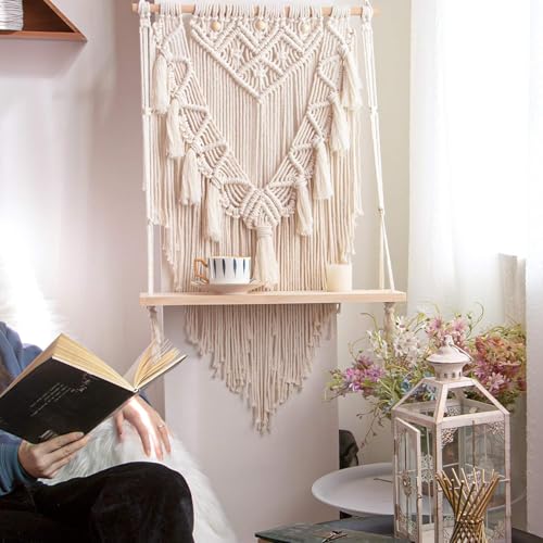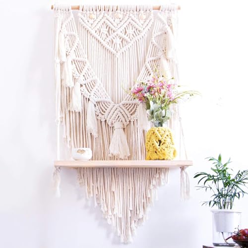 Generic - Handmade Macrame Wall Hanging with Wooden Shelf, Cream White, Cotton Rope, Boho Woven Tapestry, Decorative Home Decor for Living Room, Bedroom