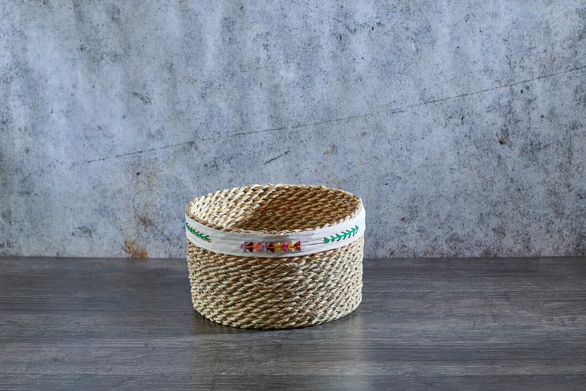 Generic - Handwoven Seagrass Storage Basket with Decorative Trim, Natural and White, Round (Width 16 cm x Height 26 cm)