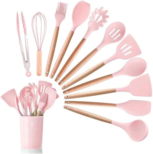 Generic - أدوات مطبخ سيليكون مع حامل، أدوات طهي غير لاصقة مقاومة للحرارة تتضمن ملعقة سباتولا وملقط ومضرب ومغرفة وفرشاة ومعلقة مخرمة لتقليب الطعام من هانسو (لون وردي)