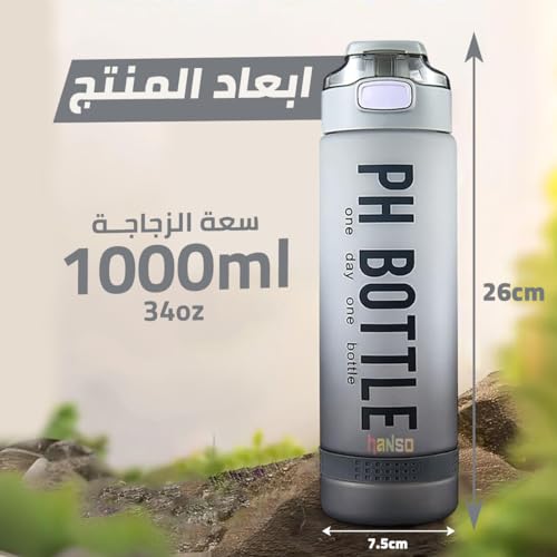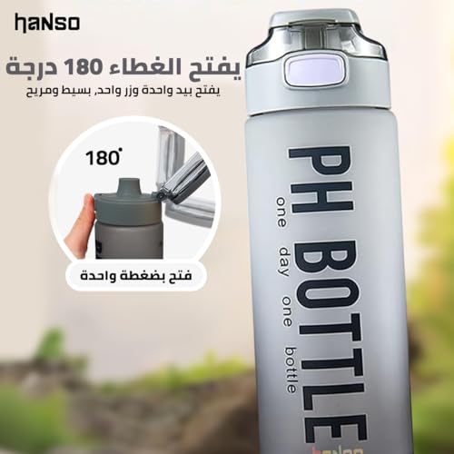 Hanso 1 - زجاجة مياه، زجاجة مياه رياضية تحفيزية مع علامات للوقت، خالية من مادة بيسفينول أ، مقاومة للماء، زجاجة رياضية محمولة للدراجة والتخييم، 1 لتر (رمادي) من هانسو