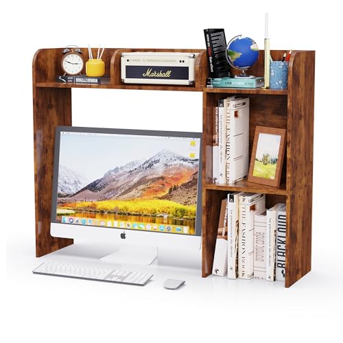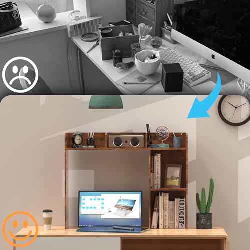 HANYEE - HANYEE Desktop Bookshelf, Wood Desk Hutch with 5 Shelves for Computer Desk, Adjustable 3-Tier Display Rack, Multipurpose Desktop Bookshelf Storage Organizer for Home Office College Dorm, Brown