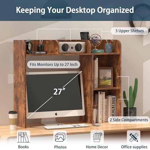 - ✅keeping your desktop organized :This desktop bookshelf is specifically built for computer desks, providing ample storage that can accommodate up to a 27-inch computer monitor, It features with 3 upper shelves and 2 large side compartments for easy categorization of your items.