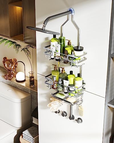 HapiRm - HapiRm Hanging Shower Caddy-Shower Caddy over Shower Head with Two Soap Holders, No Drilling Shower Organizer with 12 Hooks, Rustproof & Waterproof Shower Storage for Bathroom - Silver