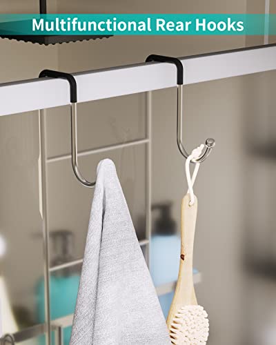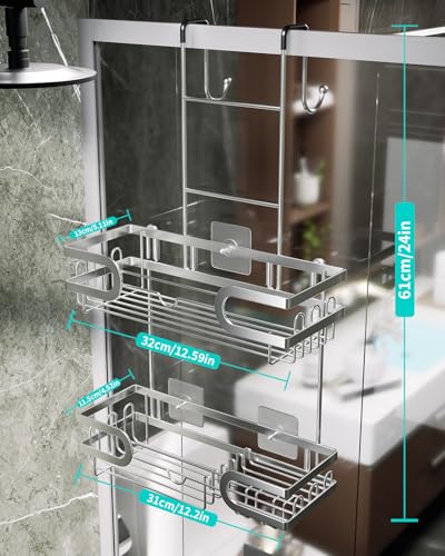 - ✅【Hooks & Save Space】 Our shower caddy over shower head comes with 14 hooks, specially designed for hanging your bath accessories like towels, bathrobes, razors and more. With a large capacity of 12.59*5.11*24 inches, this over the door shower caddy can stores all the toiletries in one place, greatly reduces the occupation of bathroom and provides you with more space for activities.