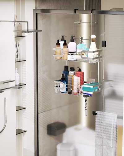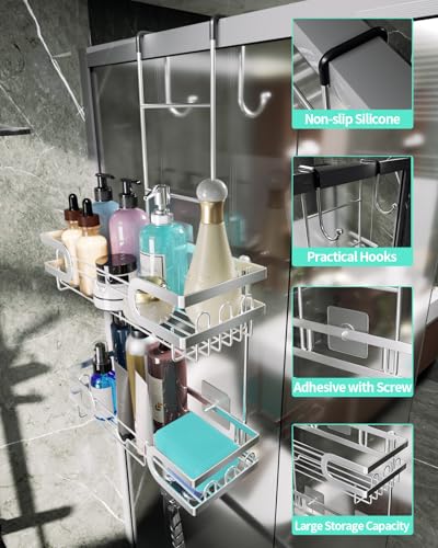 HapiRm - HapiRm Shower Caddy over Door- Hanging Shower Organizer with 14 Hooks and Soap Holder, No Drilling Hanging Shower Caddy, Rustproof & Waterproof Stainless Steel Shower Shelf-Silver