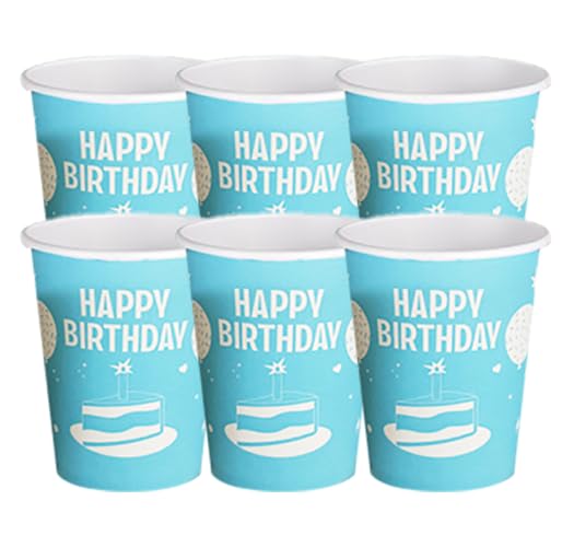 LC - اكواب ورقية لحفلات عيد ميلاد سعيد، تصميم ازرق وابيض، عبوة من 6 قطع