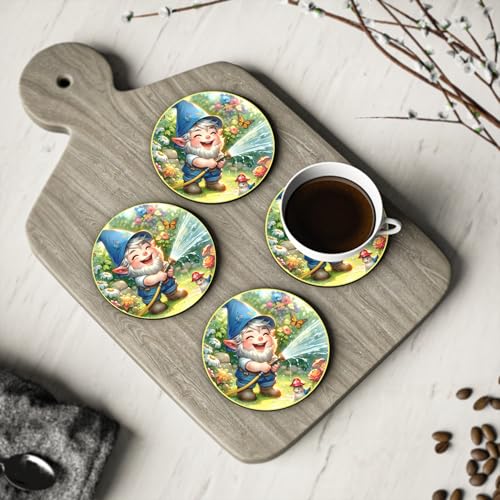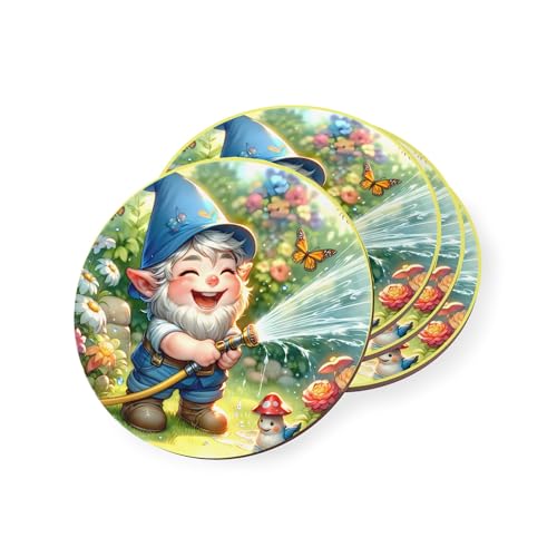 Generic - Happy Gnome with Hose, Birdie, and Toadstool Drink Coasters – Round Cute Drink Coaster for Home or Office Decor Rubber Coaster Set Heat-Resistant & Durable - Set of 4