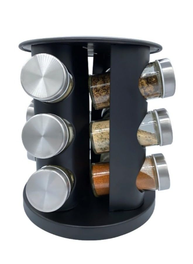 Generic - Happy Home 12-Piece Glass Spice Jar Set with Revolving Rack - Includes 120ml Airtight Round Glass Jars for Spices, Herbs, and Seasonings - Black