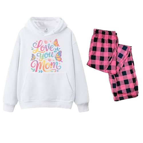 Generic - طقم هودي وبنطلون بيجامة بعبارة Happy Mother's Day مطبوع عليه Love Your Mmom، هودي ابيض مع بنطلون بينك، قطعتين مقاس (M)