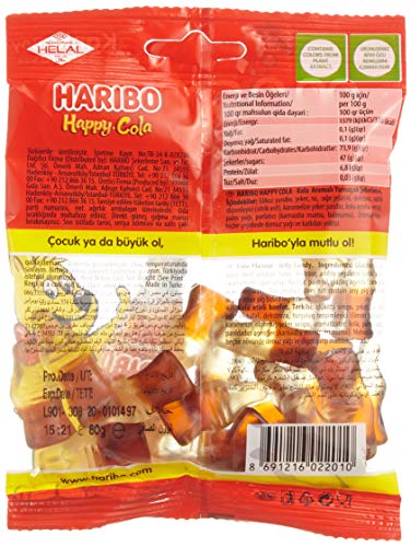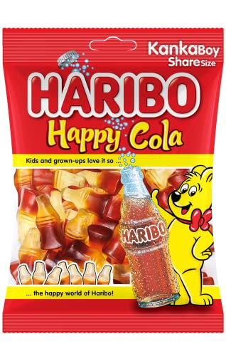 - Brand: HARIBOType: Jelly CandyWeight: 80 gramsHigh Quality Taste.Delicious treat for snacking, sharing, or topping ice cream.Two toned gummies come in a fun bottle shape and have a delicious cola taste.