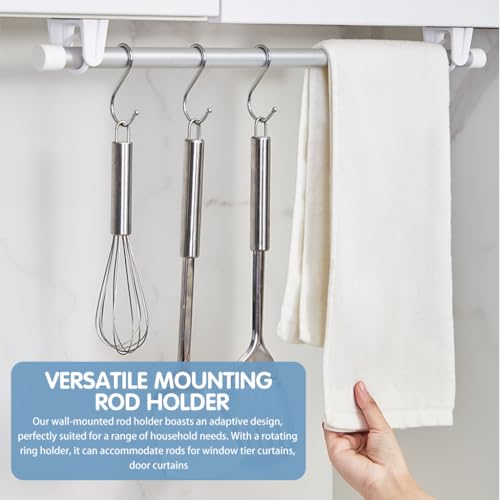 - VERSATILE MOUNTING ROD HOLDER: Our wall-mounted rod holder boasts an adaptive design, perfectly suited for a range of household needs. With a rotating ring holder, it can accommodate rods for window tier curtains, door curtains, bathroom towels, wardrobes, or even shower curtain setups. Its flexible nature ensures you can safely hang your rods in multiple locations, including tricky wall corners, for a practical addition to any room.