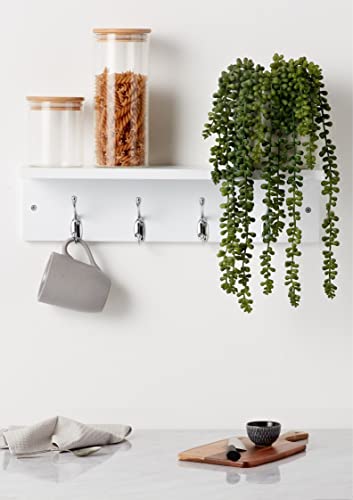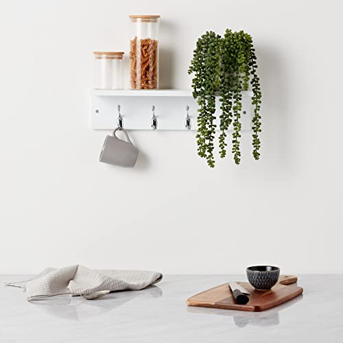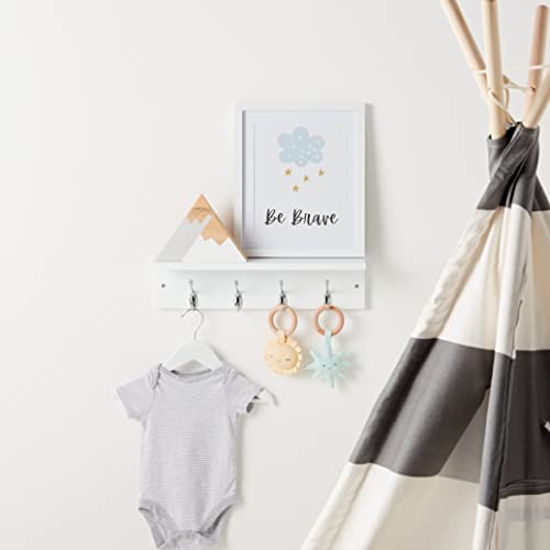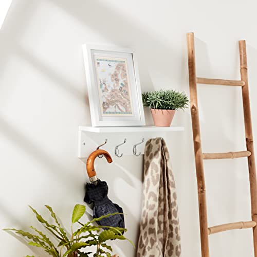 Haus Projekt - Haus Projekt Wall Shelf with Brass Hooks, White, Wall Mounted Coat Rack, 4 Pegs, Floating Wall Hook Shelf, Wooden Wall Hooks, Storage Hooks for Hanging Coats, Towels, Kitchen Storage, 11.5 x 45 x 11.5