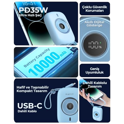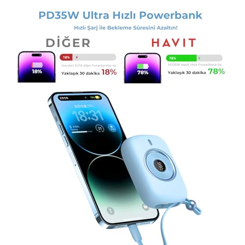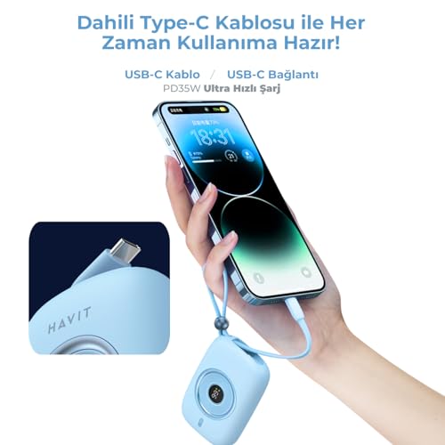 havit - شاحن باور بانك صغير مع كابل مدمج نوع C بقدرة 10000 مللي امبير في الساعة وقوة شحن 35 وات من هافيت، لون أرجواني، موديل PB5214
