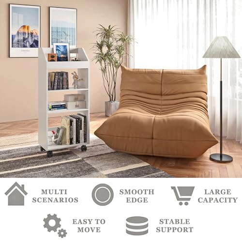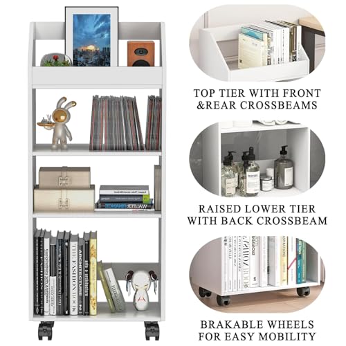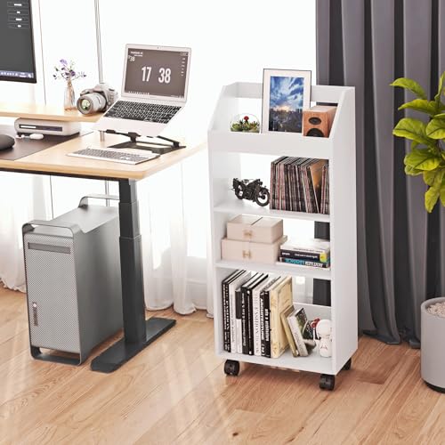 HAYOFAMY - 4-Tier Mobile Bookshelf, White Bookcase with Wheels, Rolling File Holder Desk File Book Organizer for Home Office Living Room School