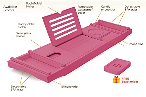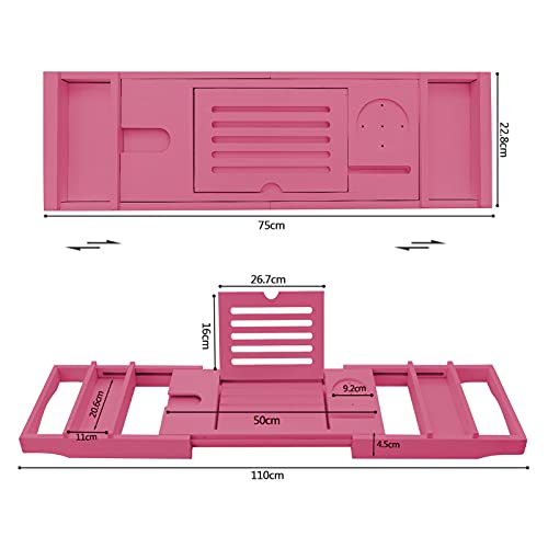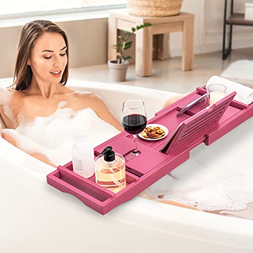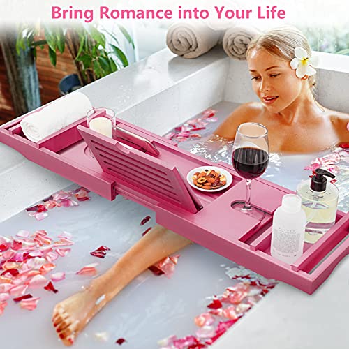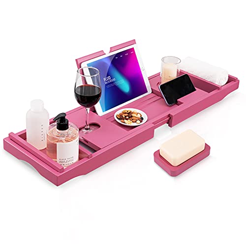 hblife - اتش بي لايف صينية حوض استحمام من الخيزران [متينة وغير قابلة للانزلاق] حمام وسرير لشخص او شخصين جوانب ممتدة تناسب اي حامل جوال ايباد وكؤوس النبيذ صابون مجاني - بينك زجاج زهري مستطيلي