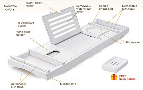 - SAFELY HOLDS YOUR BOOK, TABLET OR SMARTPHONE- The bath caddy for tub is designed to fit all your needs safe and sound. Place your precious gadgets on the solid bamboo frame holder and enjoy the moment. Nothing can fall into the tub.