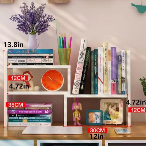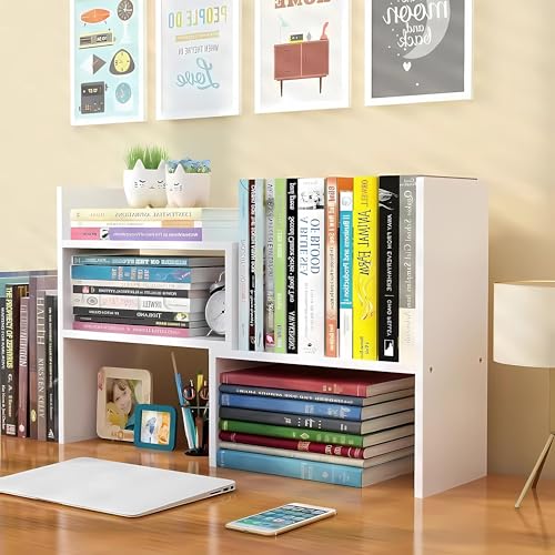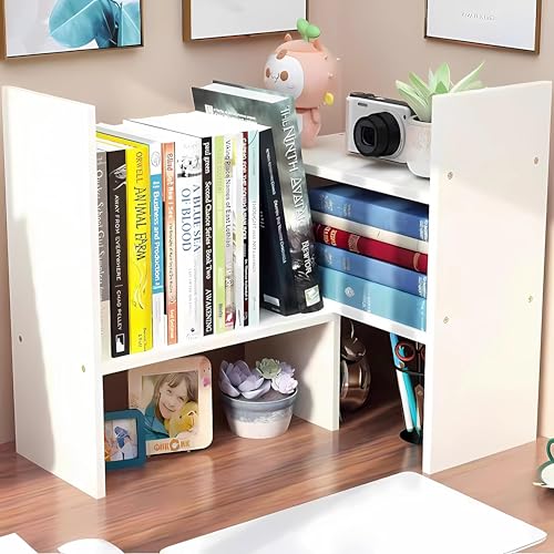 Hbluefat - Hbluefat Adjustable Desktop Bookshelf, Small Desk Bookcase, Tabletop Wood Display Shelf Storage Organizer for Home Office (White)