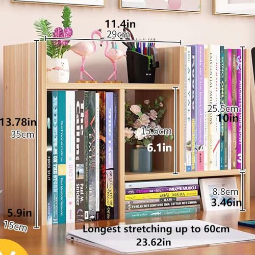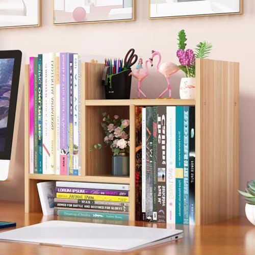 Hbluefat - رف كتب صغير قابل للتعديل من اتش بلوفات، منظم تخزين خشبي قابل للتوسيع لسطح المكتب، رف تخزين مكتبي، رف عرض، منظم لوازم المكتب (خشب الجوز الفاتح)