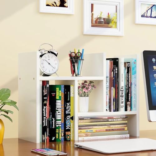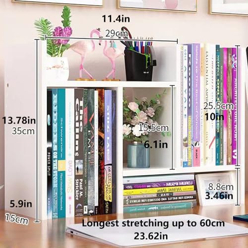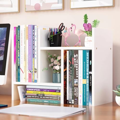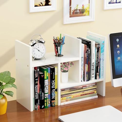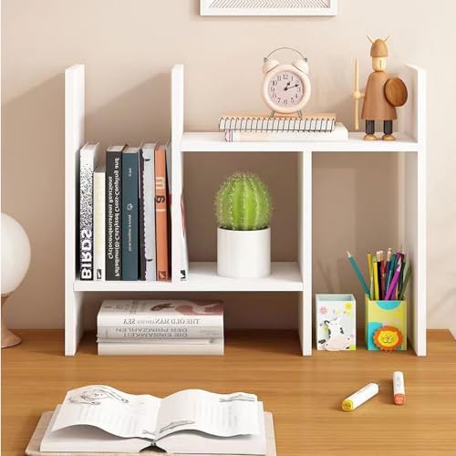 Hbluefat - Hbluefat Adjustable Small Desktop Bookshelf,Wood Expandable Desktop Storage Organizer, Desktop Organizer Office Storage Rack, Display Shelf Rack, Office Supplies Desk Organizer (White)