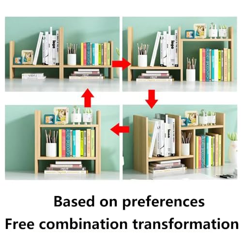 - Humanization Design:The bookshelf has 2 main parts. The position and the distance between two parts can be adjusted to best fit your needs. 2 Parts can be used separately or pushed close together to create a small shelf rack, or pulled further apart to create a longer shelf, or set together at any angle you choose to best fit your space and your style, maximize use your space Space-saving Design. The small size makes this bookshelf perfect for any desk, writing desk, table or countertop. Take full advantage of your desktop space and keep your desktop clear. Great gift for children, students, family and friends
