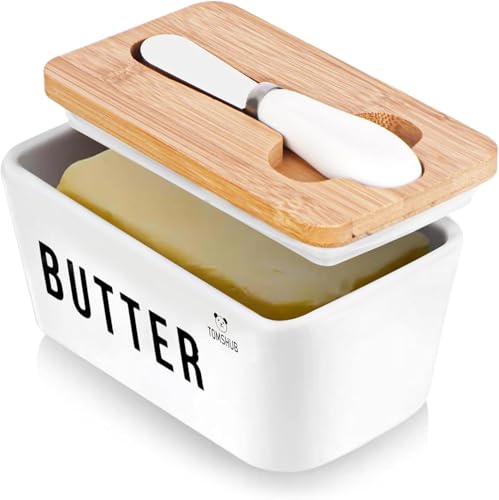 Generic - طبق حفظ زبدة صحي من البورسلان - يخلصك من الفوضى مع غطاء خشبي محكم وسكينة قطع سهلة