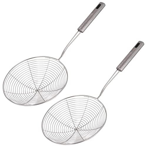 - Multifunctional: Perfect for frying utensil you need for frying up your favorite french fries, fish, vegetables, meats and more.The concave mesh is strong and supported with a strong pipe that won't bend or get way. It is one of the essential tools in the kitchen that let you make your favorite dish with ease.