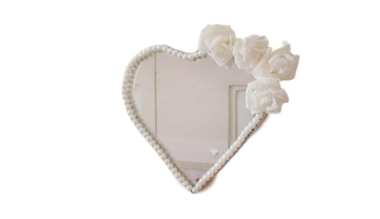 - ELEGANT DESIGN: Heart-shaped decorative mirror featuring delicate white rose embellishments and pearl-like beading along the frame