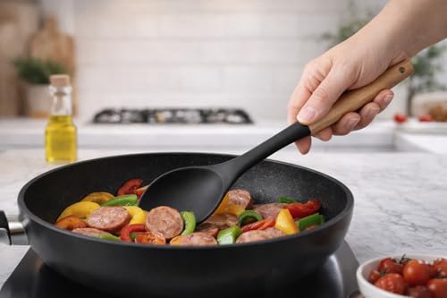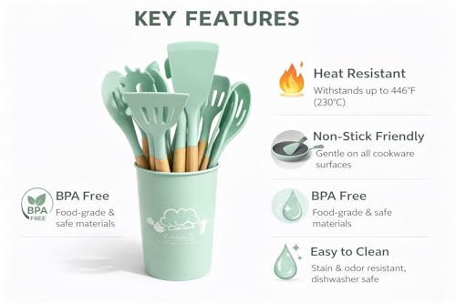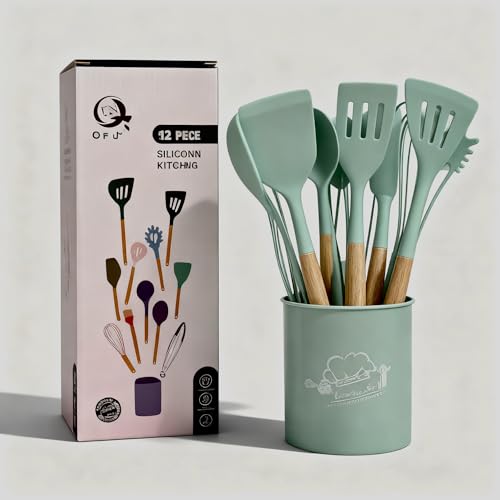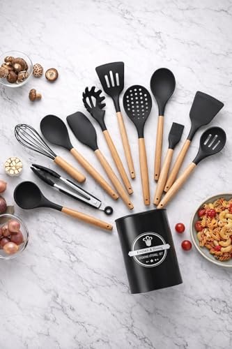 - COMPLETE KIT: 12 Piece Heat Resistant Silicone Kitchen Utensils Set with Elegant Wooden Handles and Plastic Holder Practical Organization and Storage