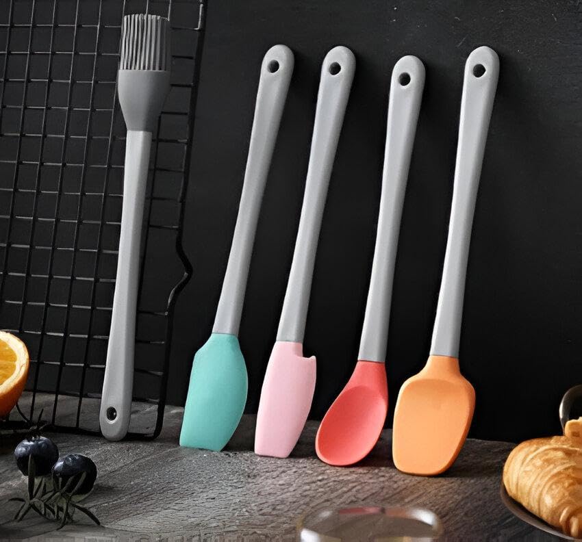 - This 5-piece silicone spatula set is perfect for a variety of cooking and baking tasks. The set includes spatulas of different sizes and shapes to suit any kitchen need, from mixing to scraping and stirring.