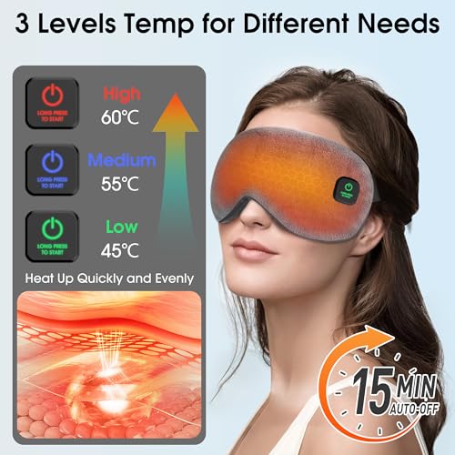 - 【3 Temperature Modes & Safety】- Our heated eye mask offers 3 smart heat settings(Low: 45°C/113°F, Medium: 55°C/131°F, High: 62°C/145°F) to meet your different needs; For dry eye relief, recommended Low heat for optimal relief; 15 mins auto shut-off ensures safety; Built-in NTC temperature control chip, with intelligent temperature control system and over-temperature protection