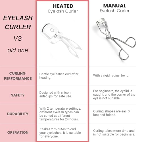 - 【Ergonomic Design】Professional eyelash curler provides even pressure to curl each lash, the silicone strip fits most eye shapes and provides precise curvature to easily create curl. Heated eyelash curler keeps eyelashes curled for a long time.