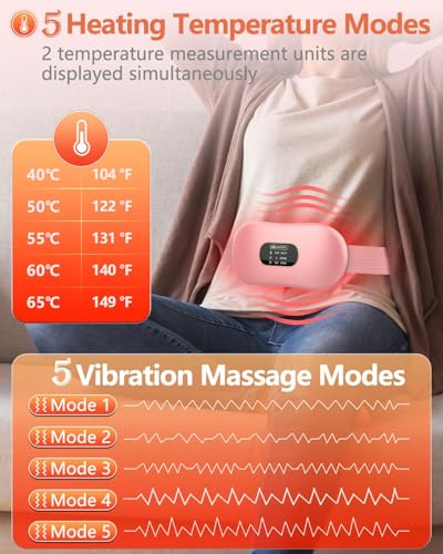 - 【3Heating&4differentVibration Massage Modes】 portable cordless heating pad provides 3different heating modes and 4differentvibration massage modes,with a 3-speed heating.You can choose the appropriate heating temperature and massaging mode according to your needs.The period cramps pain relief is combination of heating and massage not only helps to relieve menstrual pain,but also relieves stomach pain,lower back pain and abdominal pain