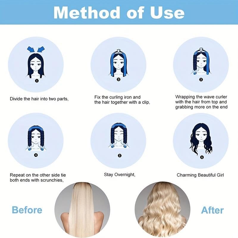 - تمويج بدون حرارة: تصميم شريط الرأس المبتكر يخلق تجعيدات وتموجات جميلة وطبيعية دون إتلاف الحرارة، مما يحمي شعرك من ضرر أداة التصفيف
